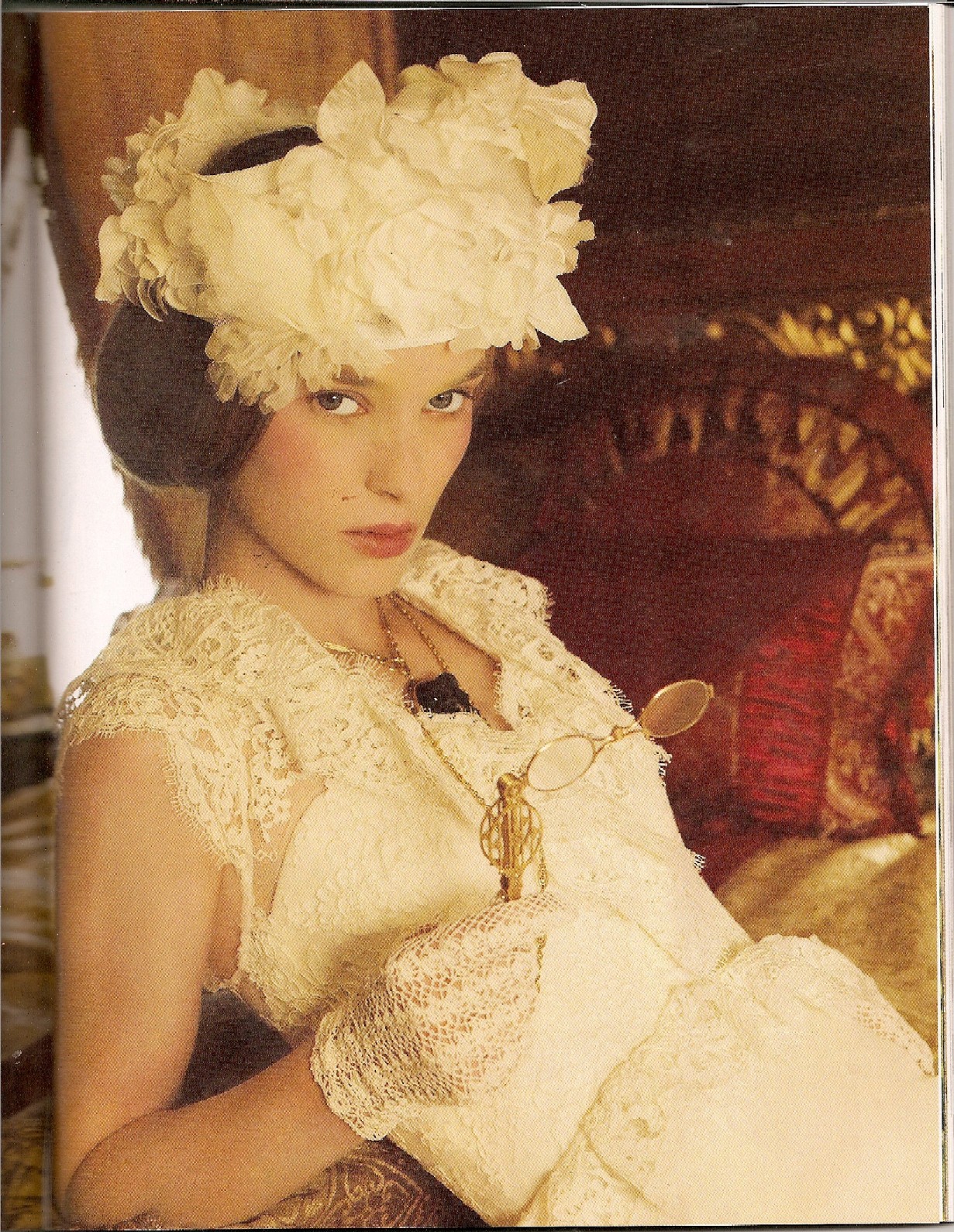 A model wearing an Antique gold Lorgnette chain necklace, from Sam Saidian. Bed of Roses, Modern Bride
